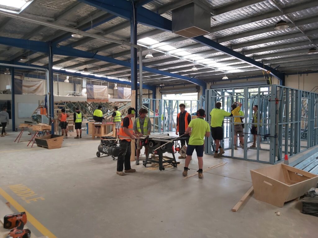 Each stage of the Carpentry training program follows the sequence of the building process. First-year apprentices begin with safety and foundational skills, while learning introductory skills on framing, foundations, flooring systems, trusses and roofs across five training blocks. In the second year, students construct an almost granny-flat-sized home with timber and steel frames, floors, installation of windows and doors, and ceilings across six blocks. By the third year, apprentices complete full home structures, mastering stairs, wet areas, cladding and roof systems over five intensive blocks of training.